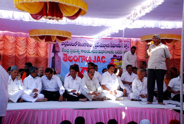 Telangana leaders express anguish and disappointment at SKC report at a dharna held by TJAC in Indira Park, Hyderabad on Thursday.