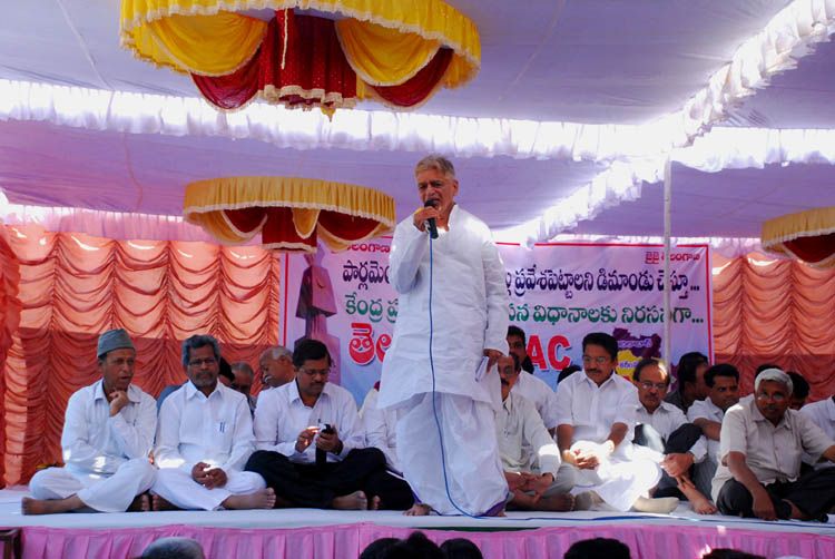 Telangana leaders express anguish and disappointment at SKC report at a dharna held by TJAC in Indira Park, Hyderabad on Thursday.