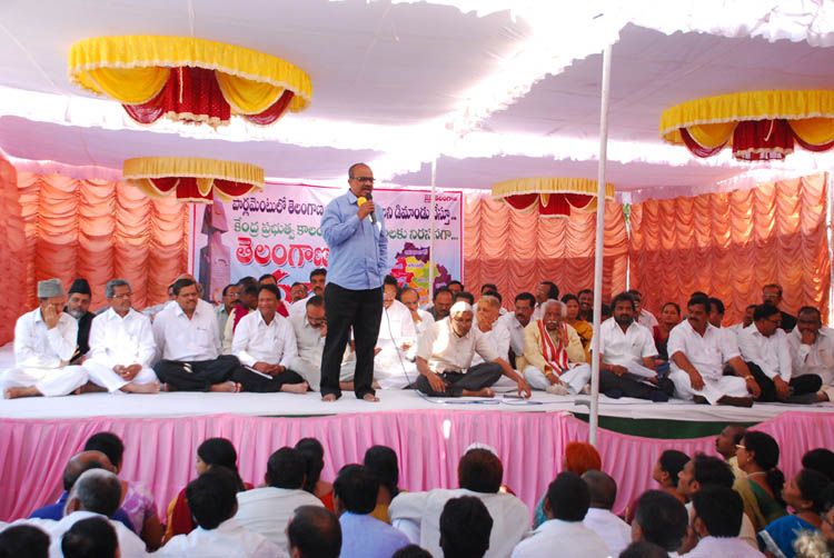 Telangana leaders express anguish and disappointment at SKC report at a dharna held by TJAC in Indira Park, Hyderabad on Thursday.