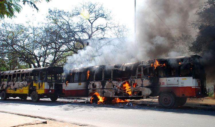 RTC buses are set ablaze, allegedly by students of the Osmania University after the disclosure of the Justice Srikrishna Commission Report in Hyderabad on Thursday. INN Photos