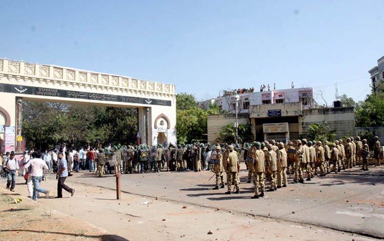 Violent protests against the Srikrishna Committee's report on the formation of Telangana intensified at the Osmania University campus on Thursday evening. The police had to resort to lathi-charge, tear gas and fire rubber pellets at the agitating students. The police personnel deployed at the university had to fire in the air to quell the protests.