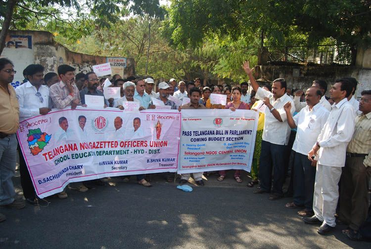 Activists of the Telangana NGOs protest at the district Collector Office to press for creating of Telangana state at Abids in Hyderabad on Friday. INN Photos