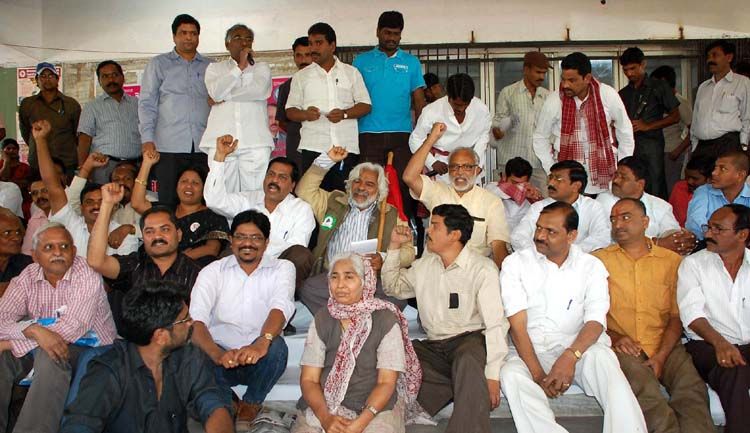 Telangana Praja Front president Gaddar participates in a protest for Telangana at Gruh Kalpa building at Nampally in Hyderabad on Friday. INN Photos
