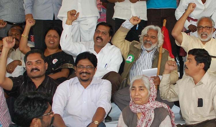 Telangana Praja Front president Gaddar participates in a protest for Telangana at Gruh Kalpa building at Nampally in Hyderabad on Friday. INN Photos