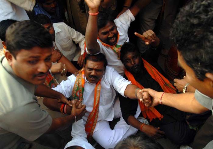 JAC of Telangana Lawyers protesting police presence near Osmania campus attempts to remove the barbed fence set up by police. Later they were forcibly taken into cutody by police at Osmania campus on Friday.