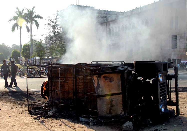 Pro-Telangana protestors burn a police jeep at Osmania campus protesting lathi charge on Friday.