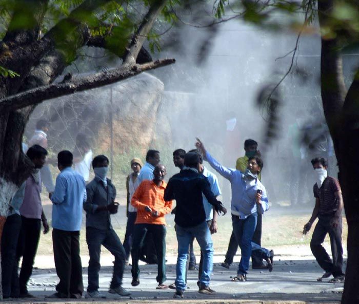 The tussle between security personnel and students of the Osmania University goes on at the campus in Hyderabad on Friday. INN Photos
