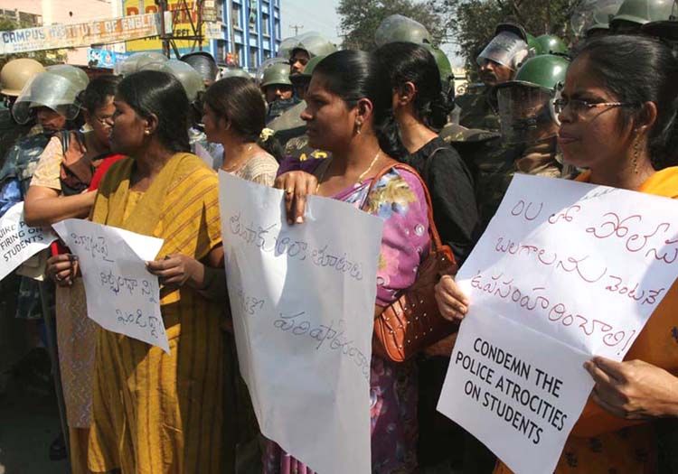 Women members of the Telangana Political Joint Action Committee and other Telangana protagonists being arrested by police after they launched a silent protest, demanding that the paramilitary forces are withdrawn, at Osmania University in Hyderabad on Saturday. INN Photos