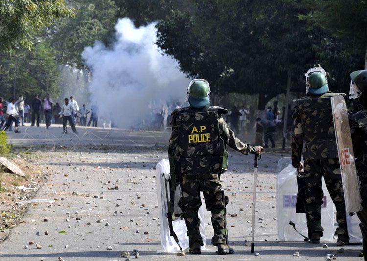 Bare-chested students take on police personnel in full battle gear at the Osmania University campus in Hyderabad on Saturday. The students are protesting against the recommendations offered by the Justice BN Srikrishna Committee Report and demanding that a Bill on separate Telangana state is introduced in Parliament. INN Photos