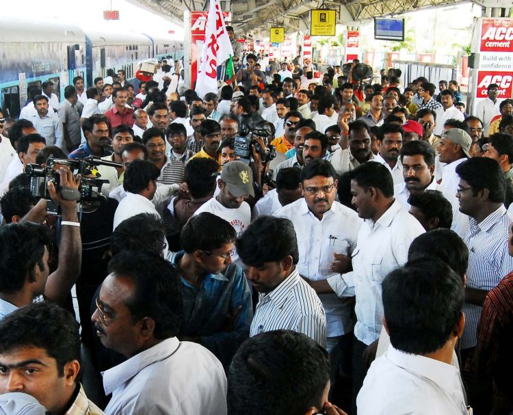 Former Kadapa MP YS Jaganmohan boards a special train on his way to New Delhi for his one-day Jal Deeksha, a protest to be staged at Jantar Mantar on January 11 to highlight the adverse impact of the Krishna Water Dispute Tribunal verdict, at Secunderabad Railway Station on Sunday. INN Photos