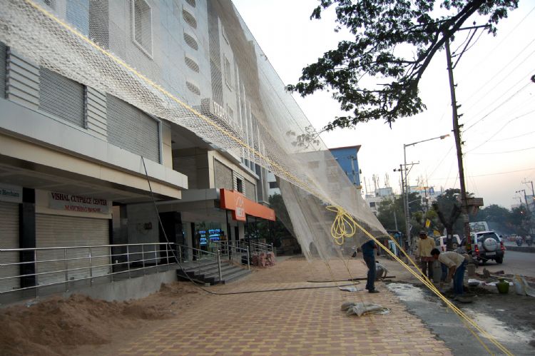 A shopping mall near the Osmania University protects its glass facade with a safety net as fears of violence and stone pelting by pro-Telangana activists prevail. Such safety nets used to be prominently visible at Banjara Hills and Punjagutta earlier. INN Photos