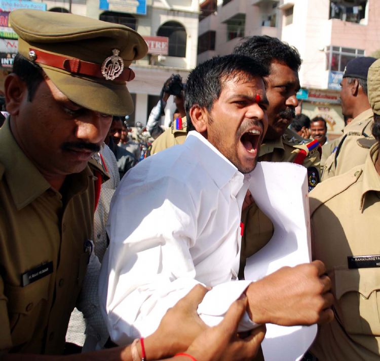 ABVP activists take out a silent protest march to Osmania University to press for the withdrawal of forces from Telangana region near the campus in Hyderabad on Sunday. INN Photos