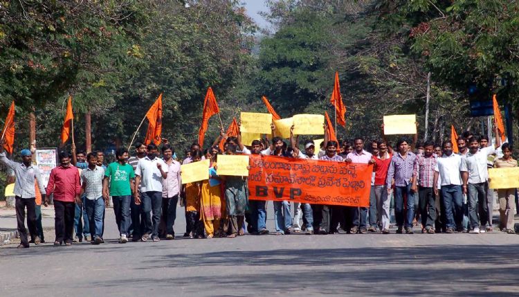 ABVP activists take out a silent protest march to Osmania University to press for the withdrawal of forces from Telangana region near the campus in Hyderabad on Sunday. INN Photos