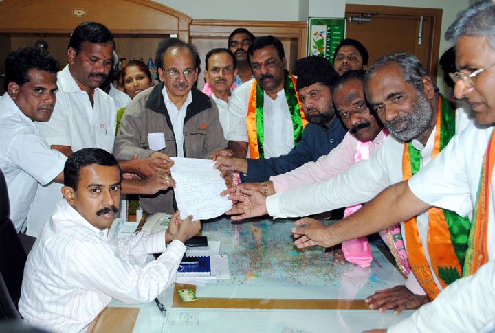TPJAC activists, including members of the TRS and BJP and other Telangana protagonists stage a protest in front of Ranga Reddy Collector’s office at Lakdi-ka-pul on Monday. BJP leaders Baddam Bal Reddy, Bandaru Dattatreya, Telangana Jagruti leader Kavita are also seen. INN Photos