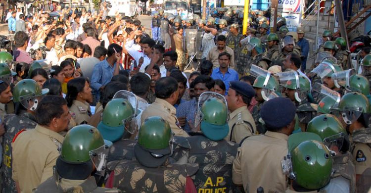 Students burn an effigy of the Central government as part of the protests demanding a separate Telangana state at the Osmania University campus in Hyderabad on Monday. INN Photos