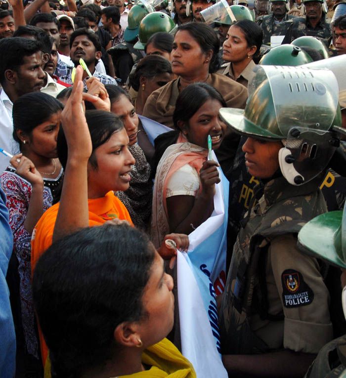 Students burn an effigy of the Central government as part of the protests demanding a separate Telangana state at the Osmania University campus in Hyderabad on Monday. INN Photos