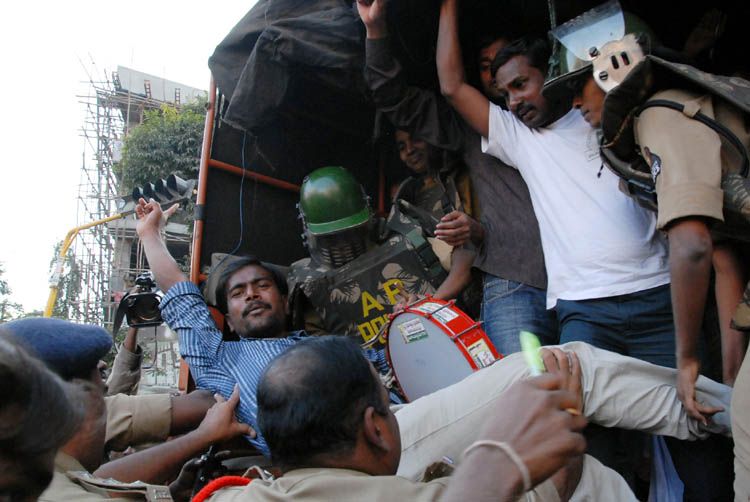 Students burn an effigy of the Central government as part of the protests demanding a separate Telangana state at the Osmania University campus in Hyderabad on Monday. INN Photos