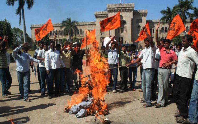 Students burn an effigy of the Central government as part of the protests demanding a separate Telangana state at the Osmania University campus in Hyderabad on Monday. INN Photos