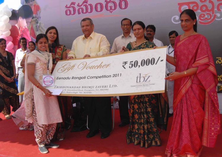 Prize winning Rangavalli: Home Minister Sabita Indra Reddy, Minister for I&PR D K Aruna seen presenting a cheque, to winner of Sankranti Rangavalli competition by Eenadu group at Peoples Plaza on Tuesday.