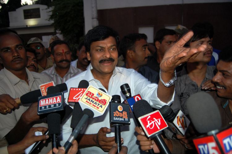 Praja Rajyam Party president K Chiranjeevi addresses media persons after extending Sankranti greetings to Governor ESL Narasimhan at the Raj Bhavan in Hyderabad on Thursday. INN Photos