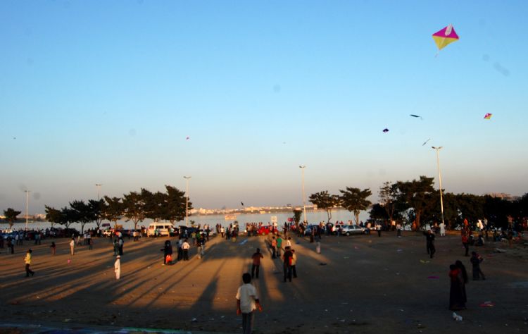 Families enjoy the Sankranti holiday by flying kites at Necklace Road in Hyderabad. INN Photos