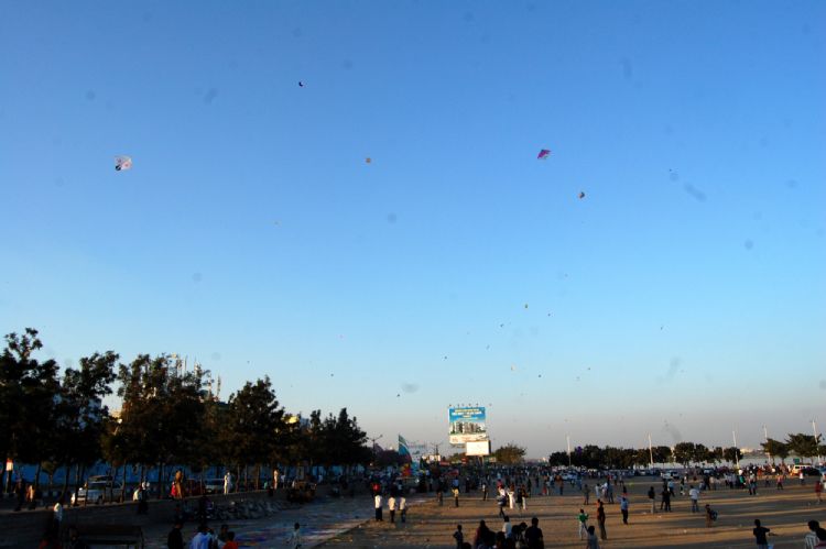 Families enjoy the Sankranti holiday by flying kites at Necklace Road in Hyderabad. INN Photos
