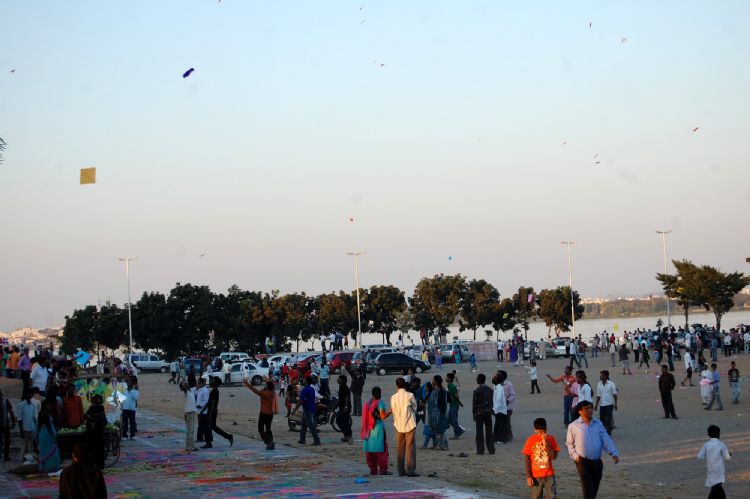 Families enjoy the Sankranti holiday by flying kites at Necklace Road in Hyderabad. INN Photos