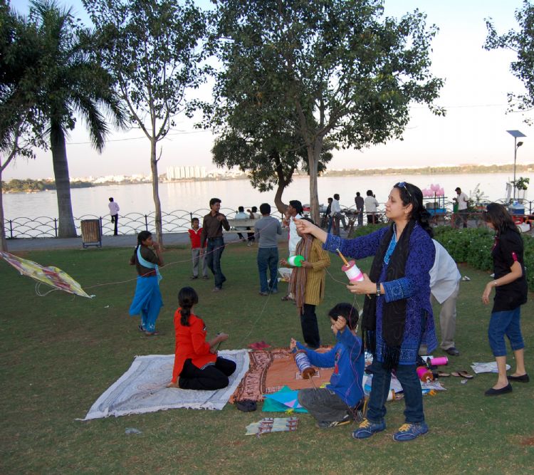 Families enjoy the Sankranti holiday by flying kites at Necklace Road in Hyderabad. INN Photos
