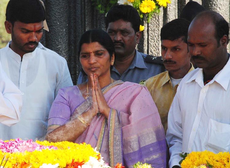 Lakshmi Parvati offers floral tributes to TDP founder-president NT Rama Rao on the occasion of his 15th death anniversary at NTR Ghat in Hyderabad on Tuesday. INN Photos