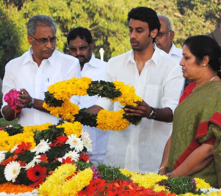Daggubati Venkateswara Rao, Purandareswari offers floral tributes to TDP founder-president NT Rama Rao on the occasion of his 15th death anniversary at NTR Ghat in Hyderabad on Tuesday. INN Photos