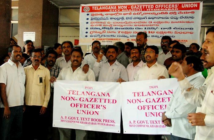 oint Action Committee of Employees, Teachers, Workers and Pensioners members raise slogans against the government as part of the pen down, tool down and chalk down strike which began in the state, at the Mint Compound in Hyderabad on Wednesday. INN Photos