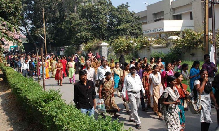 Post Graduate students at University College for Women at Koti boycott the semester examination following a call by the Telangana JAC in Hyderabad on Thursday. Out of 9,385, only 1606 students appeared for the examinations. INN Photos