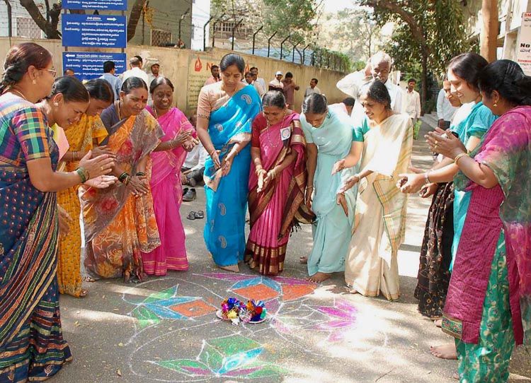 Following the pen down stir called by the Joint Action Committee of Employees, Teachers, Workers and Pensioners, government employees play 'Bathukamma' at the Hyderabad district Collectors office at Abids in Hyderabad on Friday. INN Photos