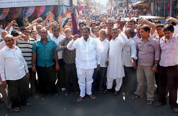Traders of the Sultan Bazaar protest against the proposed Hyderabad Metro Rail project at Koti in Hyderabad on Friday. The protestors claim that they will be without a place to run their businesses after their shops will be demolished to pave way for the prestigious public transport project. INN Photos