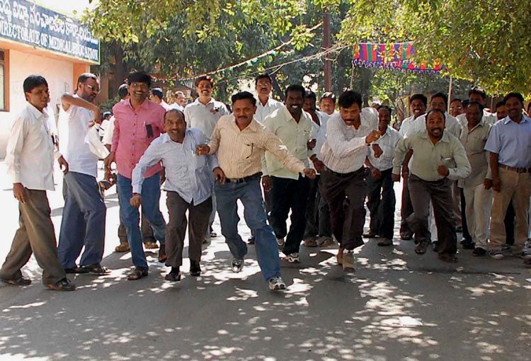 Following the pen down stir called by the Joint Action Committee of Employees, Teachers, Workers and Pensioners, employees at the Directorate of Medical Education play kabaddi at their office in Koti in Hyderabad on Friday. INN Photos