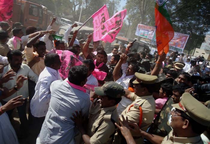 TRS and BJP activists attack Minister Komatireddy Venkat Reddy convoy with chappals and eggs demanding his resignation for achieving Telangana at Adilabad when he visited the town to oversee the arrangements for the forthcoming Rachabanda programme on Friday.