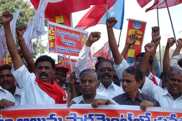 Activists belonging to the Communist Party of India picket the Ranga Reddy district Collector's Office at Lakdi-ka-pul in Hyderabad on Monday. INN Photos