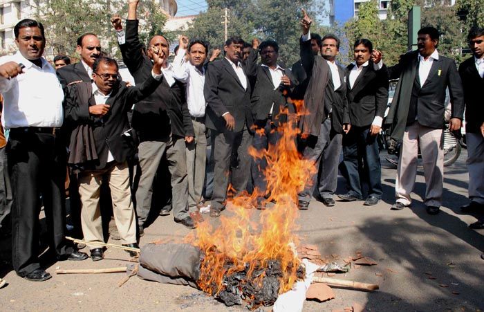 Lawyers from Telangana who practice at the Nampally Courts, burn an effigy depicting the Central Government at Gandhi Bhavan in Hyderabad on Tuesday. The protestors were demanding the introduction of a separate Bill on Telangana in Parliament. INN Photos