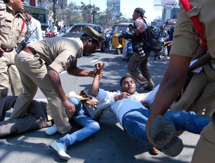 Police arrest activists of the All India Students Federation who were staging a protest against the US Immigration officials for granting students visas to a University in that country. The University has been closed for Immigration fraud, leaving many students, particularly from Andhra Pradesh in the lurch. The protesters were demanding that the US government ensures safeguards for the students there during their protest at the US Consulate in Hyderabad on Friday. INN Photos