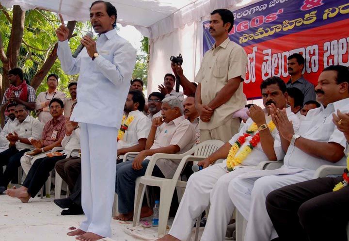 Telangana Rashtra Samithi president K Chandrasekhar Rao addresses a dharna organised by Telangana Commercial Taxes JAC Employees at Nampally in Hyderabad on Friday. INN photos