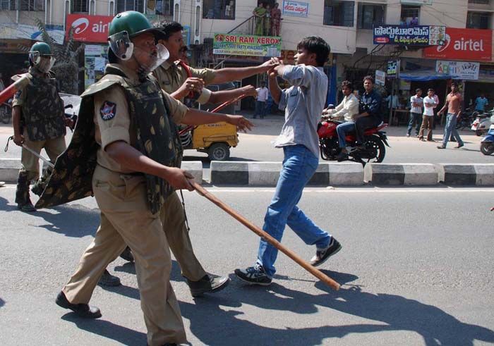Police resorted to lathi-charge on protesting students of the Kakatiya University in the campus at Warangal on Friday after the agitators refused to disperse and end their massive rally. The student leaders then called for a bandh on Saturday in protest against the high-handedness of the police.