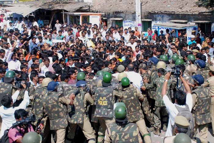 Police resorted to lathi-charge on protesting students of the Kakatiya University in the campus at Warangal on Friday after the agitators refused to disperse and end their massive rally. The student leaders then called for a bandh on Saturday in protest against the high-handedness of the police.