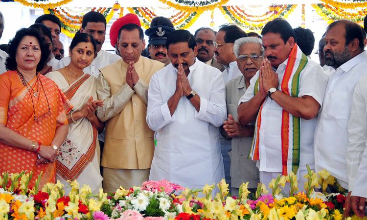 Governor ESL Narasimhan , Chief Minister N Kiran Kumar Reddy, PCC president D Srinivas and Ministers pay floral tributes to Father of the Nation Mahatma Gandhi on his 63rd death anniversary at Bapu Ghat, Langar House in Hyderabad on Sunday. INN Photos