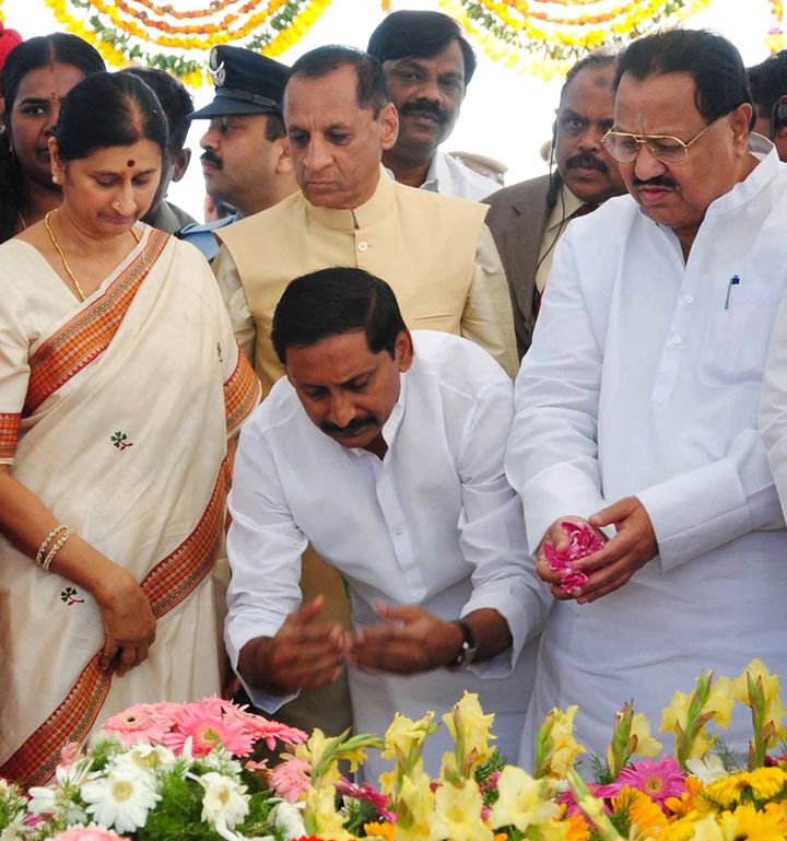 Governor ESL Narasimhan , Chief Minister N Kiran Kumar Reddy, PCC president D Srinivas and Ministers pay floral tributes to Father of the Nation Mahatma Gandhi on his 63rd death anniversary at Bapu Ghat, Langar House in Hyderabad on Sunday. INN Photos