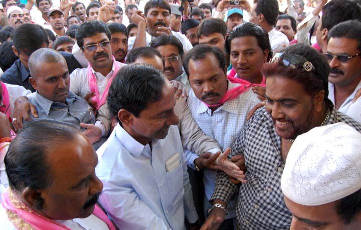 Telangana Rashtra Samithi president K Chandrasekhar Rao addresses a gathering of members of the Muslim community at a meeting held at Azam Function Hall, Azampura in Hyderabad on Monday. INN Photos