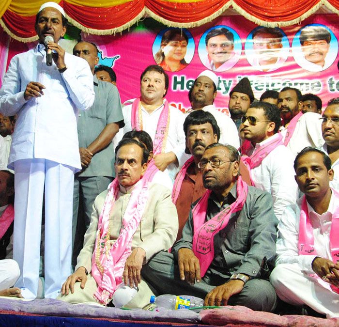 TRS president K Chandrasekhar Rao addresses a gathering of members of the Muslim community at a meeting held at Azam Function Hall, Azampura in Hyderabad on Monday. INN Photos