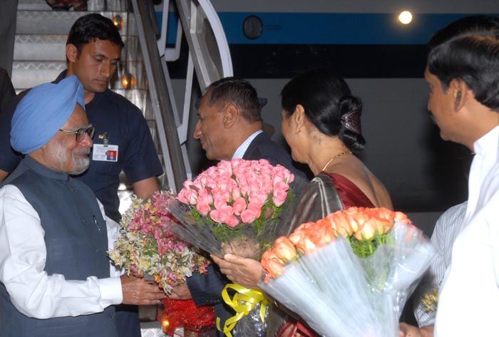 Governor Narasimhan along with his wife welcomes Prime Minister Dr.Manmohan Singh with a bouquet at Raj Bhavan on Saturday. Singh will be addressing 17th Commonwealth Law Conference on Sunday in the city.