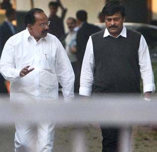 Praja Rajyam Party chief Chiranjeevi and Union Law Minister M. Veerappa Moily come out of Congress president Sonia Gandhi's residence after a meeting in New Delhi on Sunday.