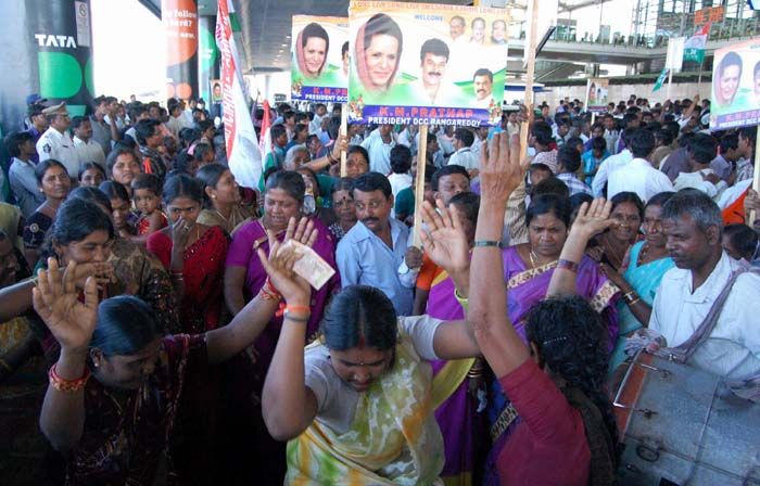 PRP president K Chiranjeevi arrives at Shamshabad airport to a rousing reception by Congress and PRP workers in Hyderabad on Tuesday. INN Photos