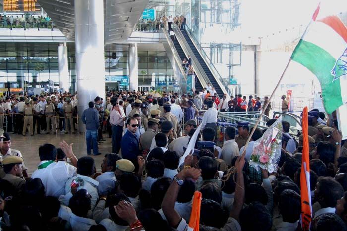 PRP president K Chiranjeevi arrives at Shamshabad airport to a rousing reception by Congress and PRP workers in Hyderabad on Tuesday. INN Photos